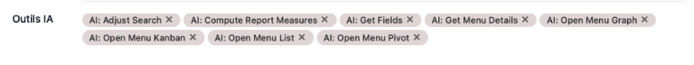 Nous les avons classés comme secondaires mais c'est le fondement des meilleurs agents IA de Odoo. Les outils s'appuient directement sur des méthodes présentes dans le nouveau module IA de Odoo.
